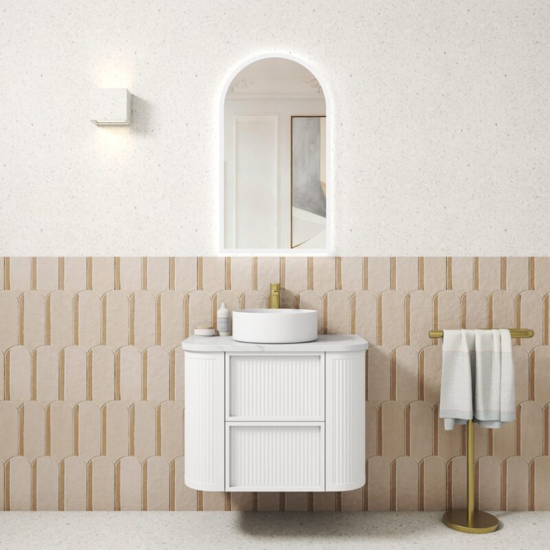 Ramee Fluted Wall Hung 750mm Matte White Cabinet – Flat Stone Top, Alpine
